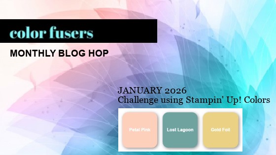 Hello and welcome to the first Color Fusers Blog Hop of 2026!!! This month, our color combination includes Petal Pink, Lost Lagoon, and Gold. Super fun!!! I never would have thought of this combo on my own, so I really had to think about what to do and search my stash. Then, I remembered a sheet of Country Woods Designer Series Paper colored Petal Pink. I absolutely love that paper, so that’s where I began. The rest of my card features new products from the January Online Exclusive including the Simply Beautiful Bundle.