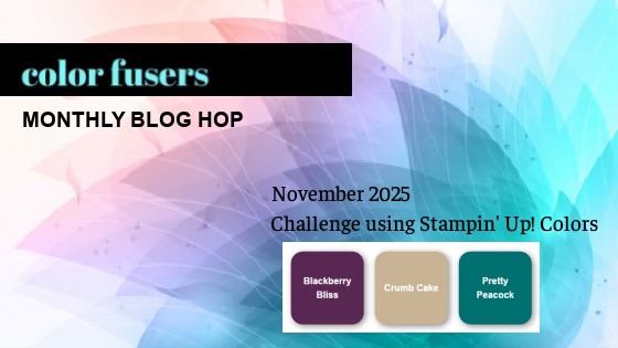 Welcome to the Color Fusers Blog Hop for November 2025! This month, we have a beautiful color combination of Blackberry Bliss, Crumb Cake, and Pretty Peacock. I absolutely LOVE it! While the colors aren’t traditional for a holiday card, I still thought they might work, and boy am I glad I tried. I love the way this card turned out.