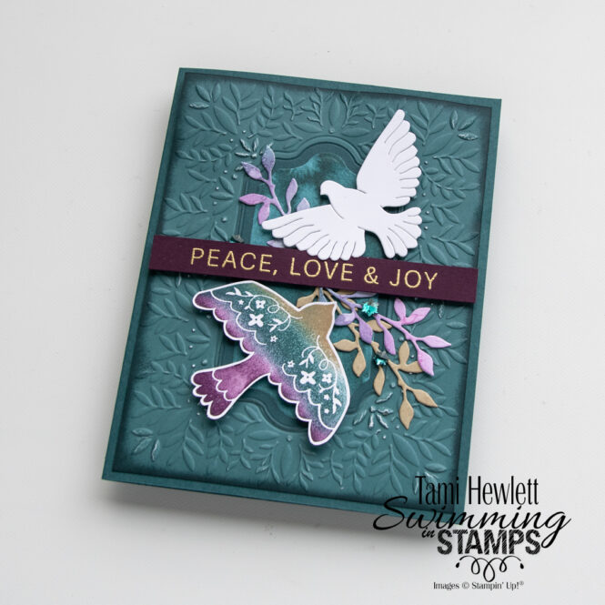 My card features the Peace On Earth Bundle and coordinating Peaceful Days Stamp Set. I used Sponge Daubers to add all three ink colors directly to the bird stamp and then stamped on Basic White Cardstock. Afterwards, I lightly blended the stamped image with a Blender Pen. I also randomly watercolored another sheet of Basic White with all three ink colors to die-cut some of the leaves.