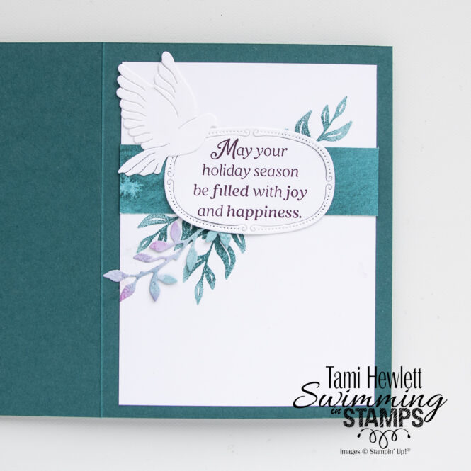 Here’s a look at the inside of the card, including a little more of the same Thoughtful Journey Designer Series Paper, some leftover die-cuts and a few leaves stamped with Pretty Peacock ink. The sentiment is from the Words For The Season Stamp Set cut with a Traditional Labels die.