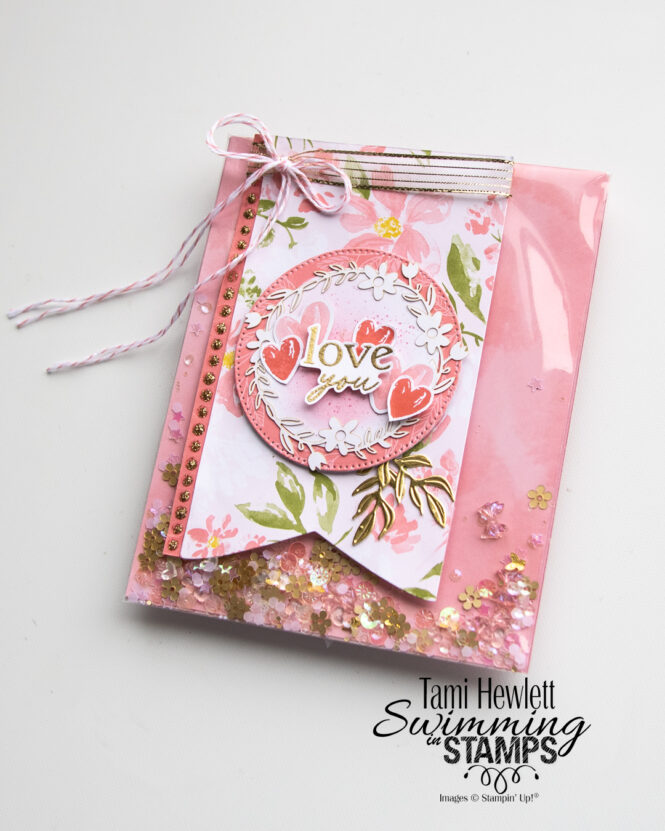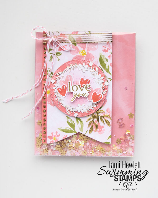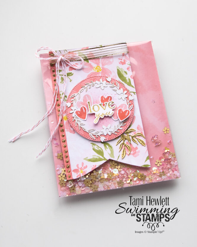 Our January Stampin’ Fancy Friday theme is “For My Love.” We’re creating projects to give to someone we love for any occasion. I decided to use the 12 Days Of Crafting Advent Calendar. I bought one for both my mom and I for Christmas and we opened them together and watched the Stampin’ Up! videos giving inspirational ideas for all the products included. And, there were A LOT of products in that calendar, including designer series paper, a couple of die-cut sets, ephemera pieces, baker’s twine, loose gems, liquid glitter, laser cuts, and more!!! I was so excited after opening everything that I just HAD to make something, and who better to make it for than my sweet mom?