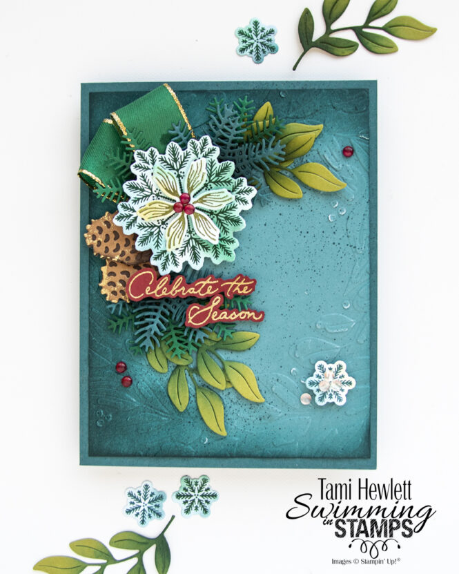 In the background, I used a layer of Pretty Peacock Two-Tone Cardstock (the light side.) I blended the edges with Pretty Peacock ink and then dry embossed the whole layer with the Traditional Wreath 3D Embossing Folder. Finally, I added some Pretty Peacock splatter.
