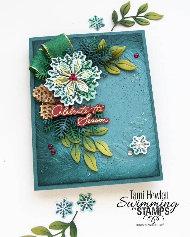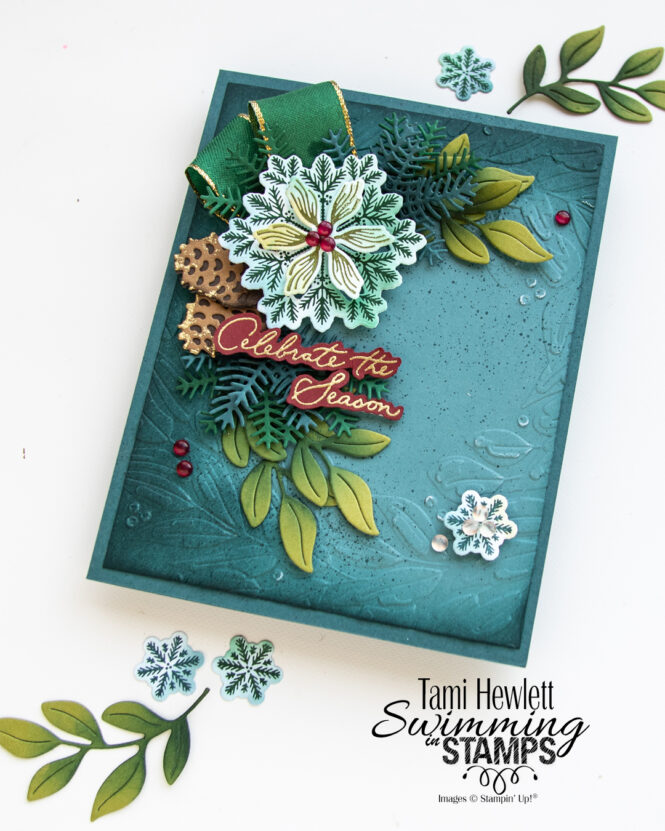 I worked hard on this card and I’m so happy with how it turned out! It features the Delicate Pines Bundle, a bundle I’ll be featuring in my next online class. (See my blog for all the details.) It really struck me as unique. It’s not quite pines and not quite snowflakes, but something in-between which is so fun and inspiring. I love the delicate images and beautiful die-cuts.