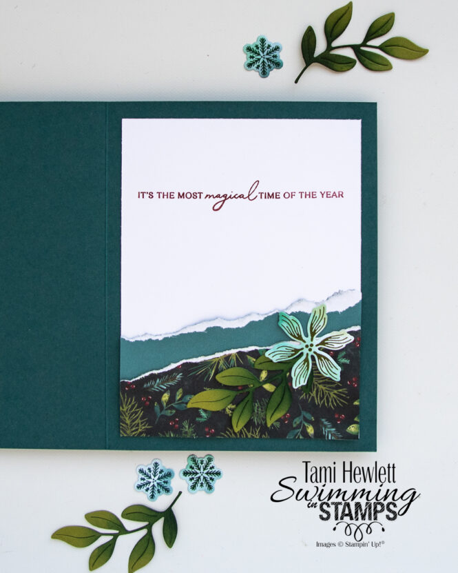 On the inside, I used a few more die-cuts and the gorgeous coordinating Elegant Pine Snowflakes Designer Series Paper.