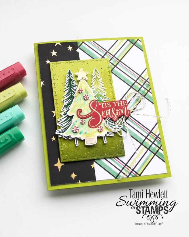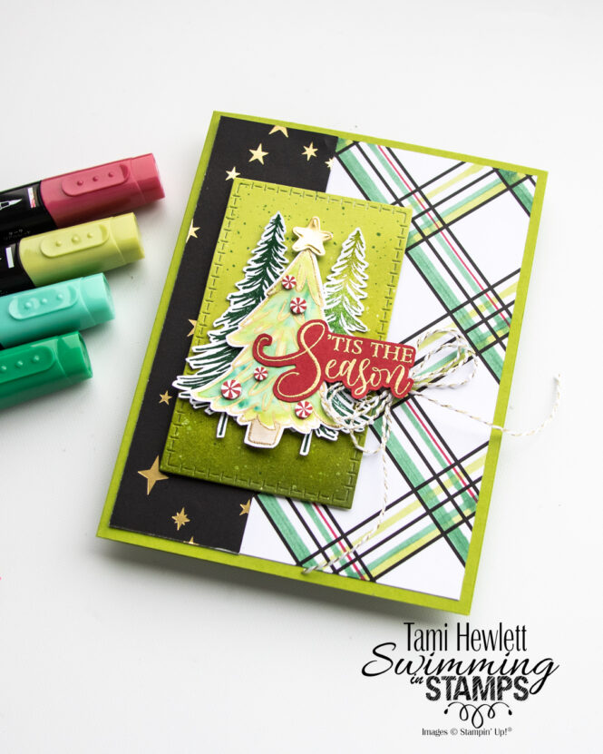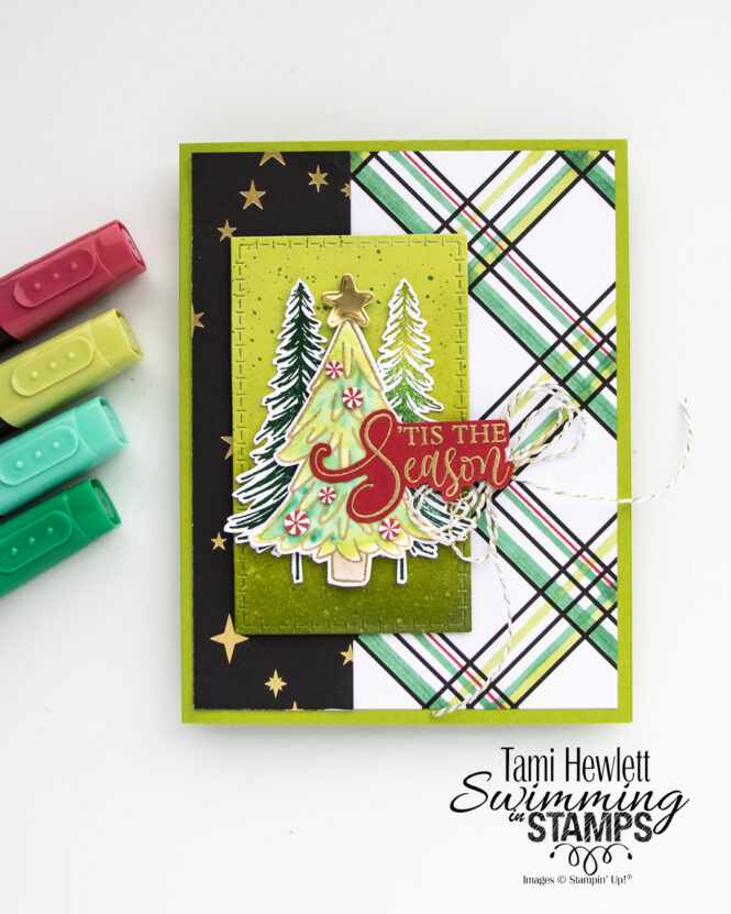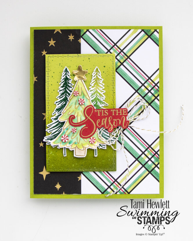 I embossed the tree in the foreground in gold on Basic White Cardstock and then watercolored it with Shaded Spruce and Granny Apple Green ink. Behind that, I stamped two thinner trees with the same colors. I decorated my tree with Real Red & White Peppermints. I thought the Real Red in those embellishments, as well as the thin lines in the plaid, helped to coordinate with the bright Real Red sentiment.