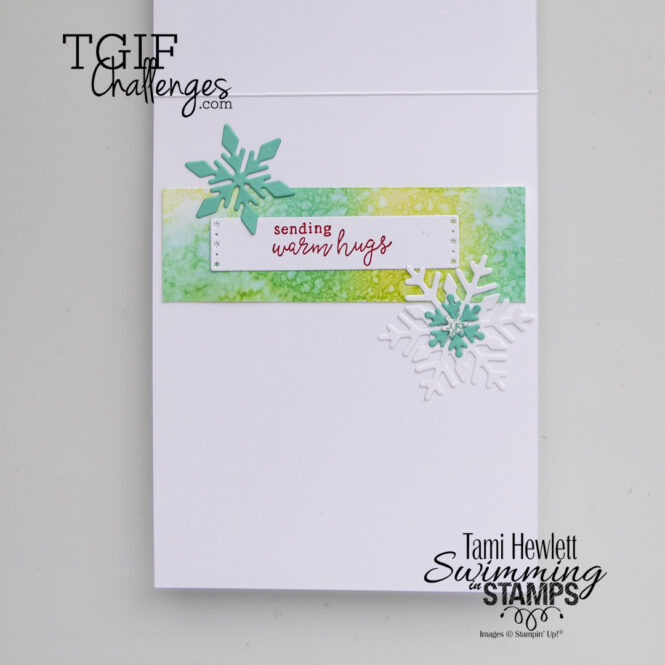 I thought it would be fun to use the Snowflake Kisses Bundle and one of my favorite coloring techniques for the background. I used Blending Brushes to add both Coastal Cabana and Granny Apple Green ink to Basic White Cardstock and then splattered the paper with water drops. The drops make beautiful marks in the ink blending. I simply dip the tip of my Water Painter into a bowl of water and tap the barrel over the paper to create the splatter. One trick I’ve learned is not to let my paper get too saturated. So, occasionally I’ll dry the paper with a heat tool to set the water marks. Then, I can add more.