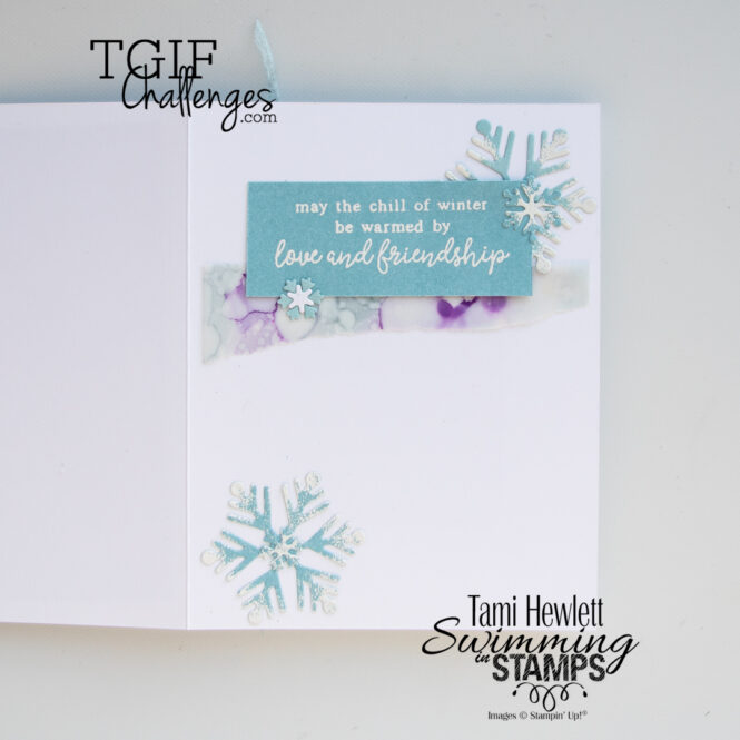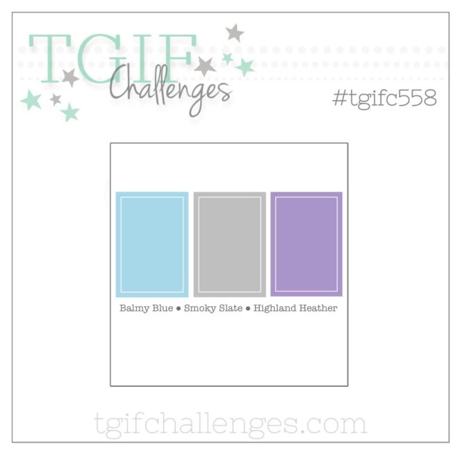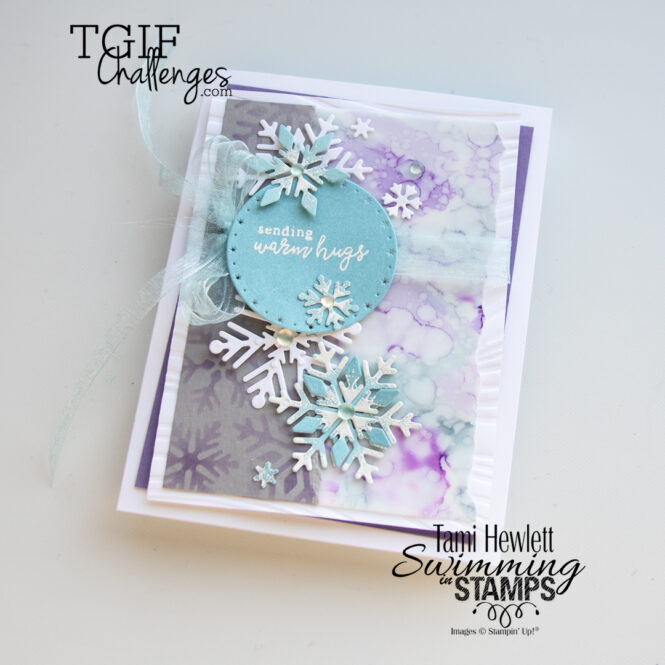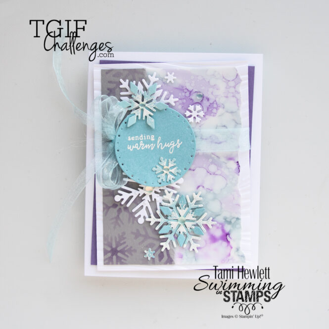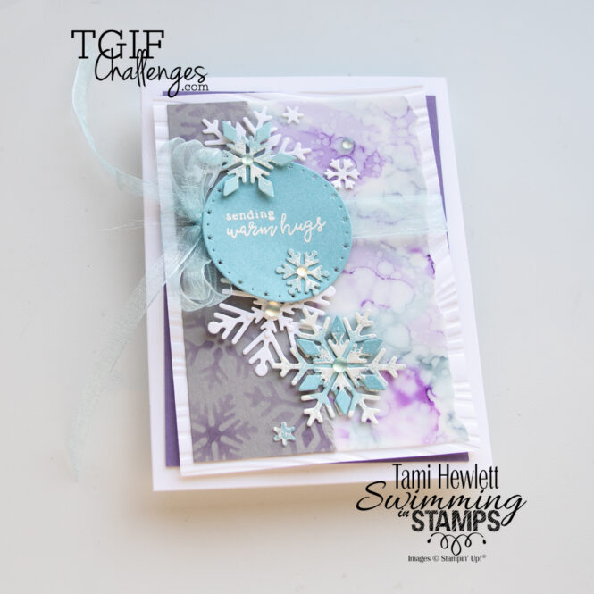 Happy New Year! The design team at TGIF Challenges is starting off the year right with a gorgeous color challenge including Balmy Blue, Smoky Slate, and Highland Heather. Soft pastels work so well for winter cards, so I immediately thought of the Snowflake Kisses Bundle for my project. I also decided to bring back an “oldie but goodie” technique that includes coloring Vellum with Stampin’ Blends Markers.