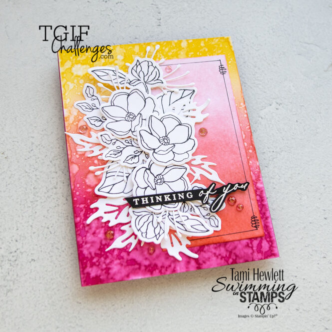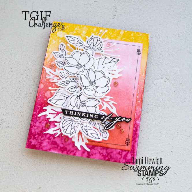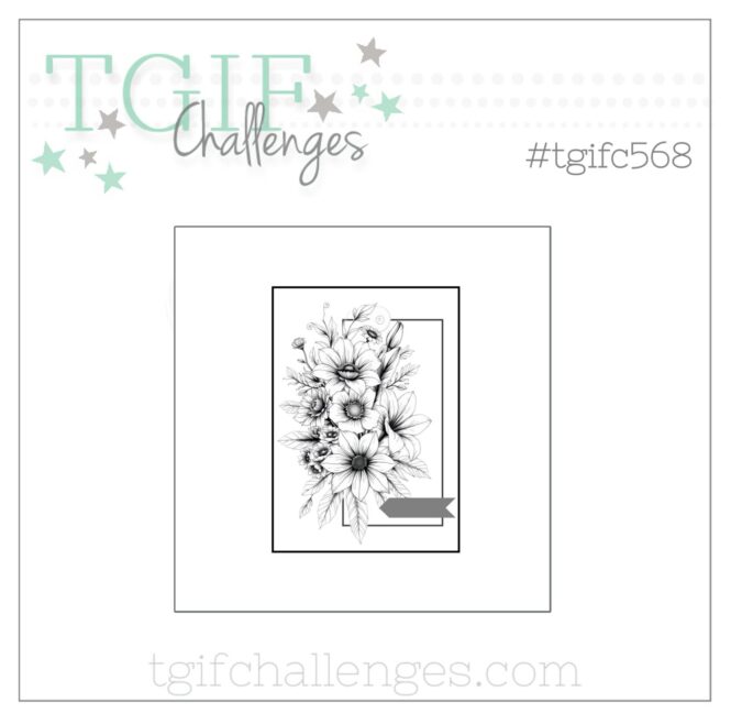Happy Friday! For this week’s TGIF Challenge, we have the sketch below. The black and white flowers immediately caught my eye. So I thought why not change things up and leave the flowers black and white and only color the background? Mixing things up is a great way to inspire your creativity and I love the results!