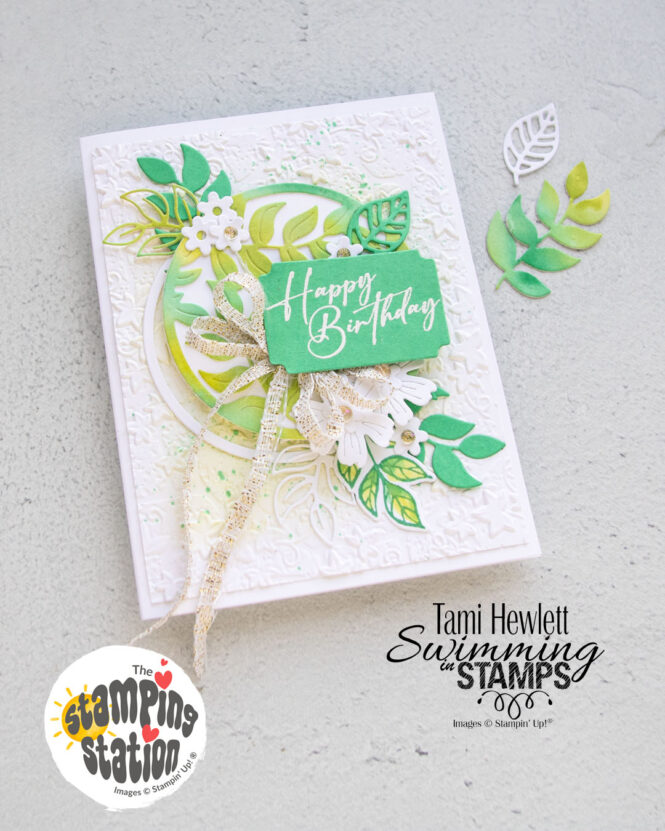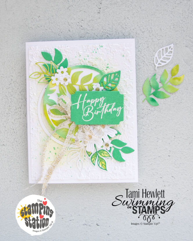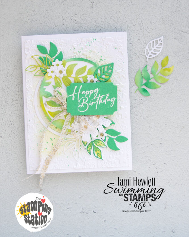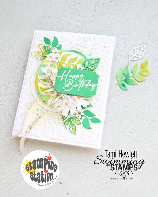 The Springtime Scenes Bundle really caught my eye when I had a preview of the new Online Exclusives. It includes beautiful stamped images and really unique dies, including several circles with beautiful leaf patterns such as the one on this card. I used Shy Shamrock, Granny Apple Green, and Lemon Lime Twist ink to randomly paint a sheet of Fluid 100 Watercolor Paper, and then used it to die-cut the intricate circle and one of the individual leaves. There’s another die in the set that cuts a solid circle, and an outline, that’s perfect for layering behind the intricate leaf circle die-cut. In fact, I didn’t want to waste the outline circle, so I layered that as well!
