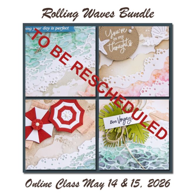 Well, I have a little bit of bad news. Stampin’ Up! just changed the expected date for the Rolling Waves Bundle (specifically the dies) to be back in stock from the week of April 27th to May 4th. I’m afraid that’s a little too tight to allow my Option 1 customers to order and sign up for the class by the scheduled class dates of May 14 and 15, so I’m going to need to reschedule.